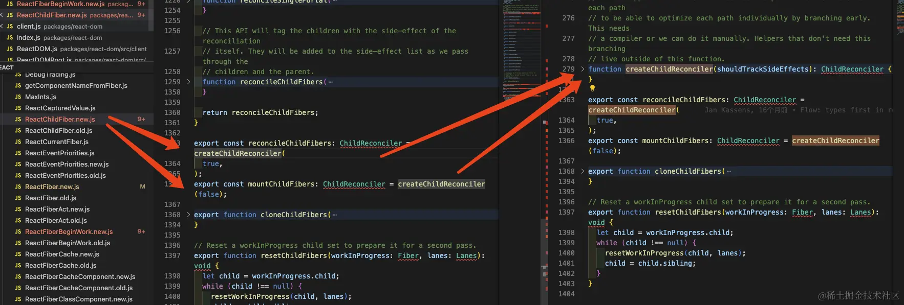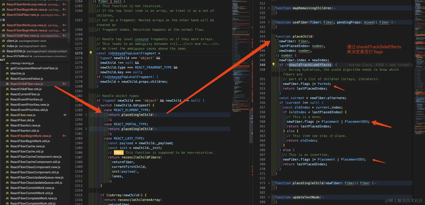 发现这俩函数其实最终执行的都是createChildReconciler方法,只是传递的参数不同,createChildReconciler接收一个参数,shouldTrackSideEffects代表是否追踪副作用,翻译过来就是在创建下一级fiberNode的时候,要不要打flags