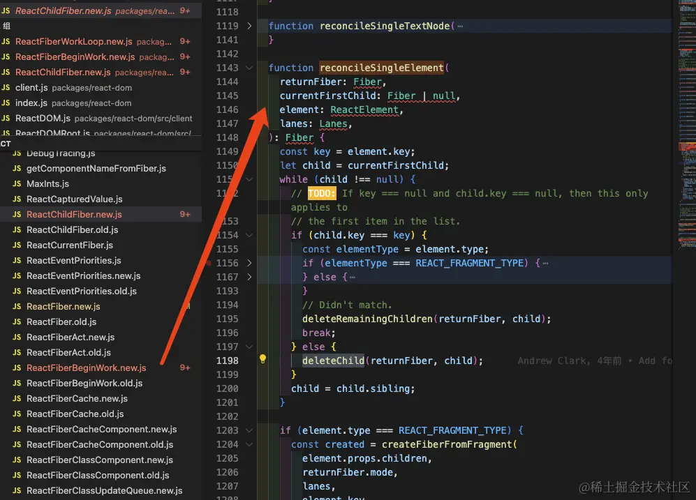 首先判断child的key 和 传递进来的ReactElement的key, 如果不相同 直接进入deleteChild函数,这个函数就是给returnFiber也就是wip上面打上删除这个current.fiber的标签,也就是要把当前的这个child在commit阶段删掉