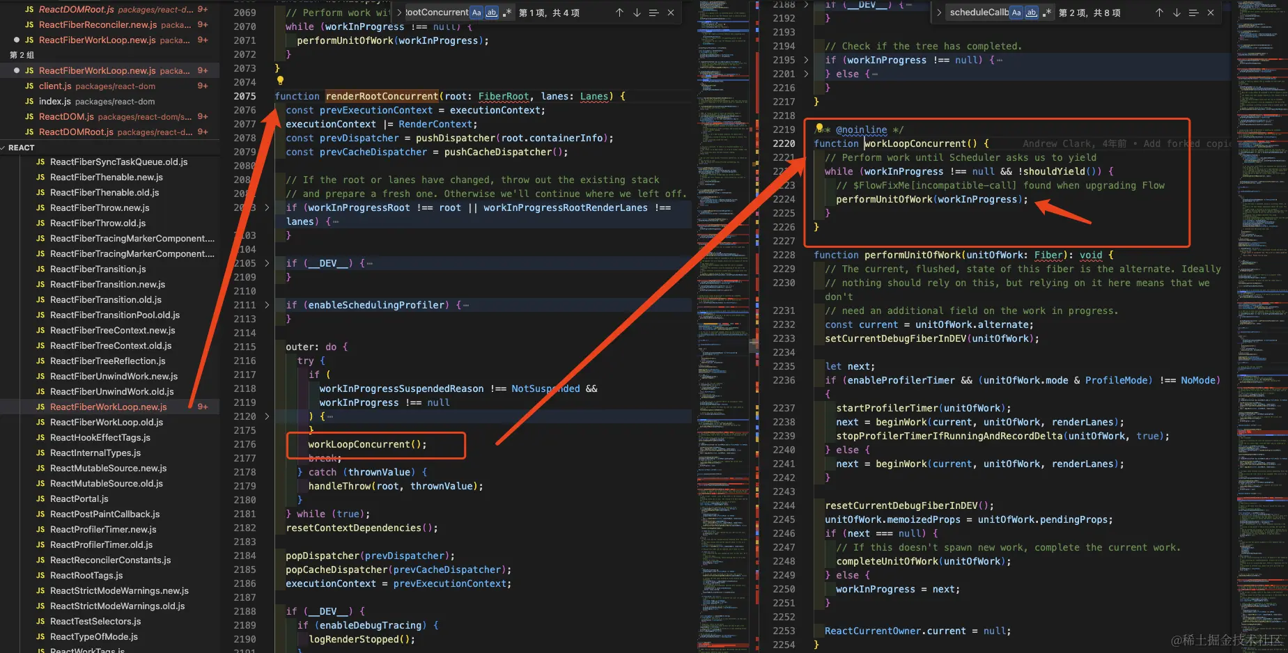 workLoopConcurrent 做的事情就是通过 while 循环反复判断 workInProgress 是否为空,判断条件是否存在shouldYield的执行,如果浏览器没有足够的时间,那么会终止while循环,并在不为空的情况下针对它执行 performUnitOfWork 函数。