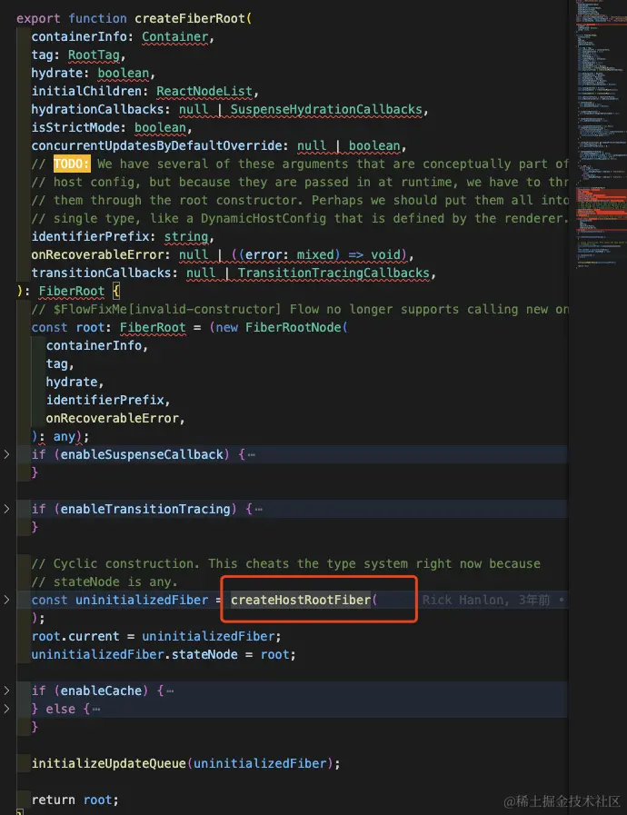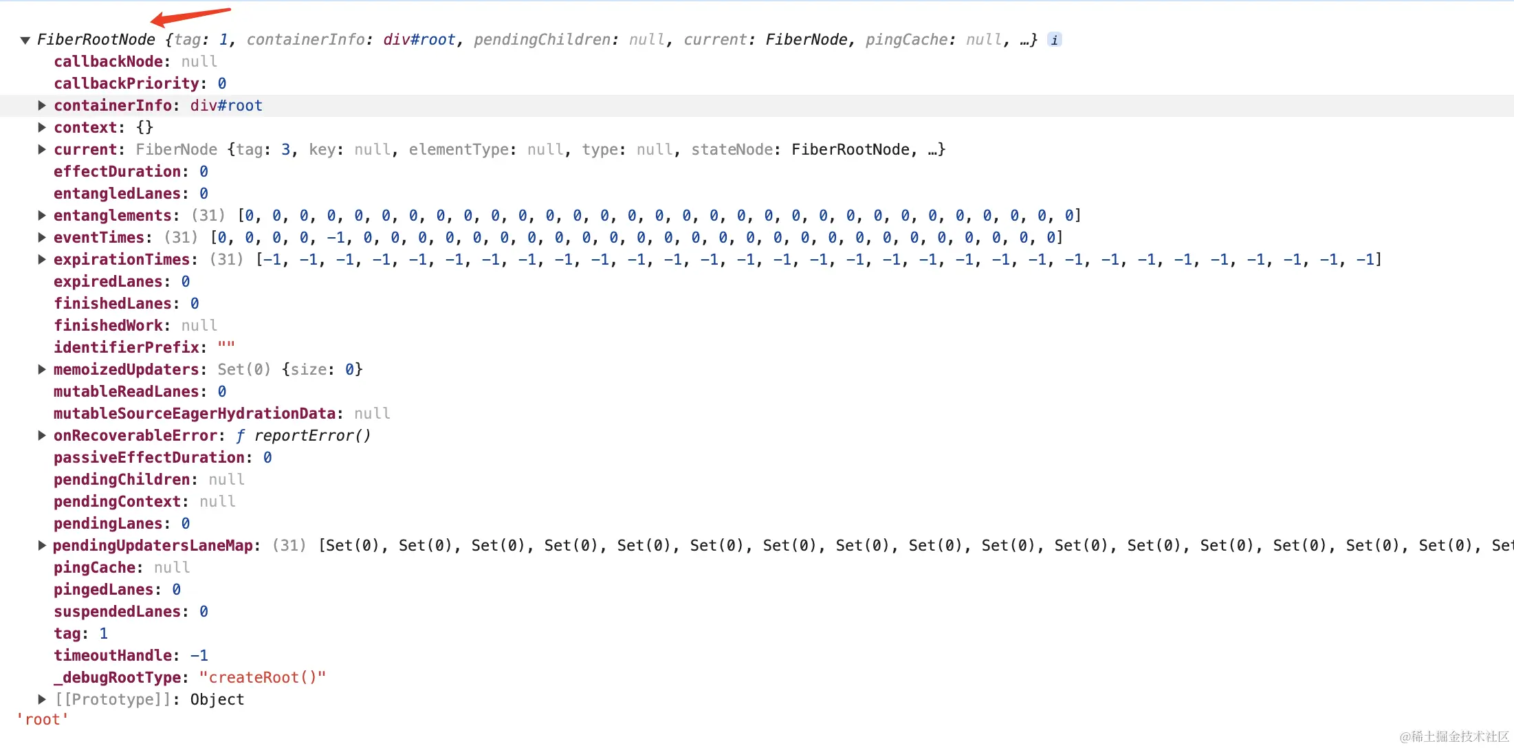 代码中的root 就是这个返回的实例,根据并且通过_internalRoot指向了createFiberRoot创建了React应用的根结点 FiberRootNode