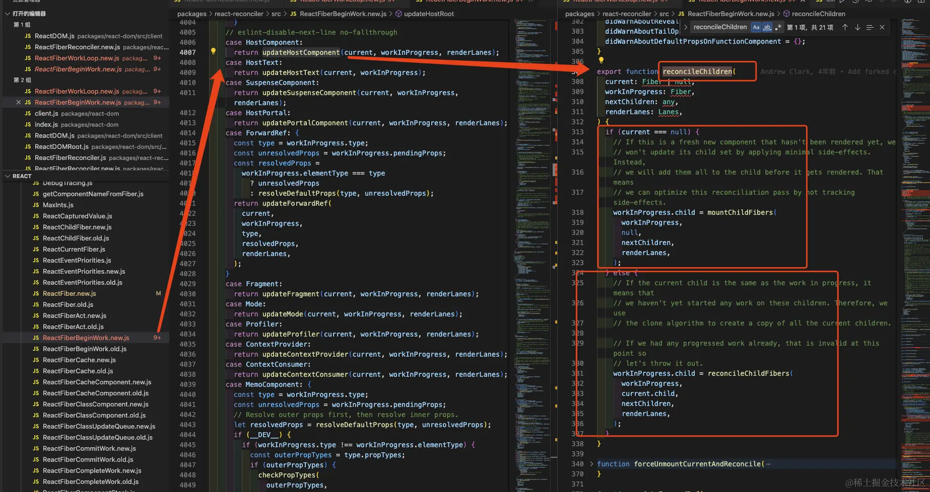 发现在mount的时候会去执行mountChildFibers, 在update的时候会去执行reconcileChildFibers