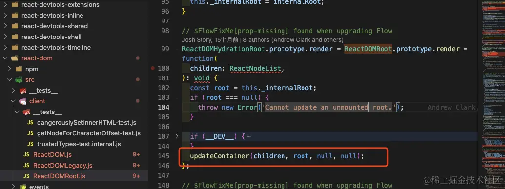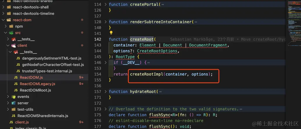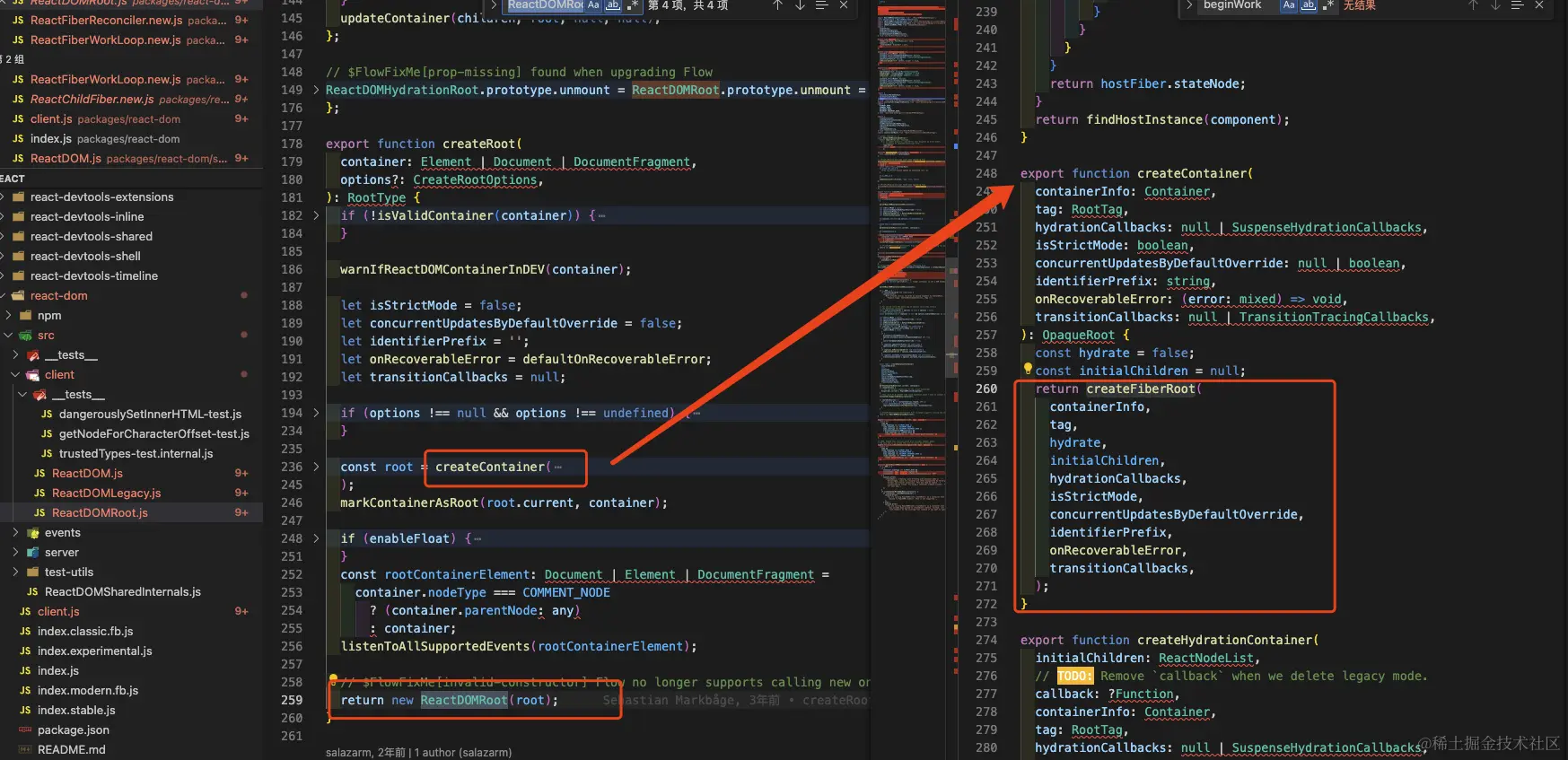 找到creatRoot这个方法,发现接受两个参数,第二个为可选参数,这里的container 就是我们传入的 div#rout