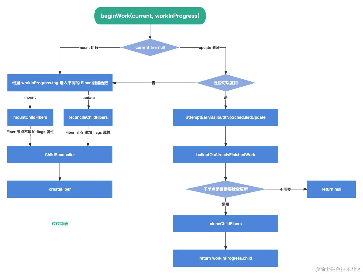 首先,beginWork会判断当前流程输入mount还是update流程,判断依据是current fiber 是否存在,如果不存在,则为mount阶段