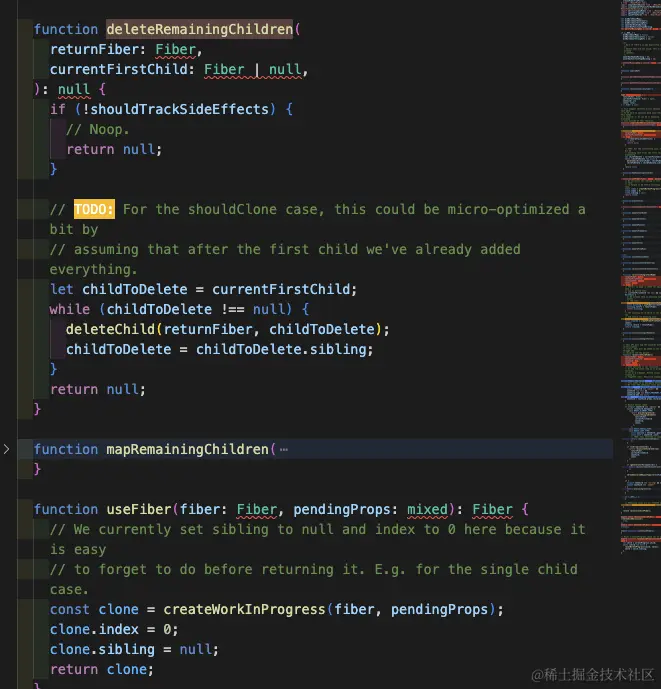如果key相同,则需要继续判断两者的type是否相同,这里面会执行2个关键函数 useFiber和deleteRemainingChildren