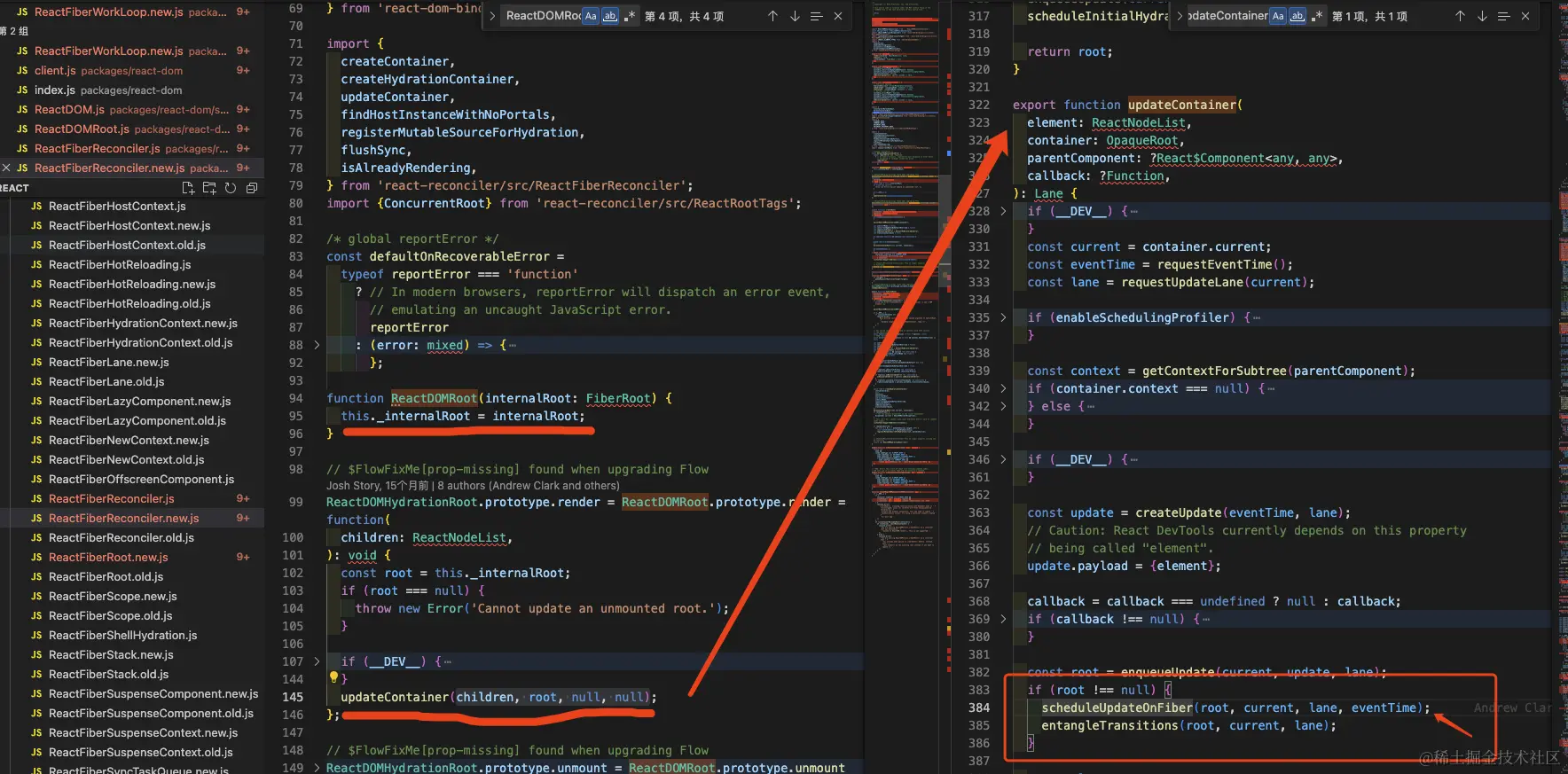 updateContainer这个函数接受四个参数,分别传递的是 children 也就是 和 root,root就是刚才创建的的FiberRootNode,还有parentComponent和cb,在启动的时候,传递的是null。