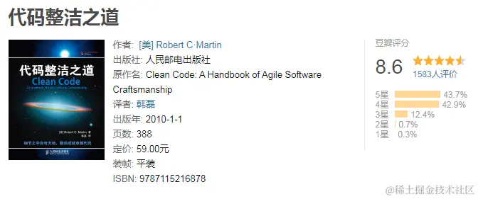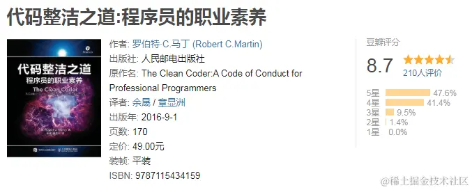 《代码整洁之道:程序员的职业素养》出版于2016年,其内容主要偏向于技术的"术"。全书内容和代码整洁关系不大,更多的是阐述软件开发者的专业精神。书中给出了很多务实性的意见。