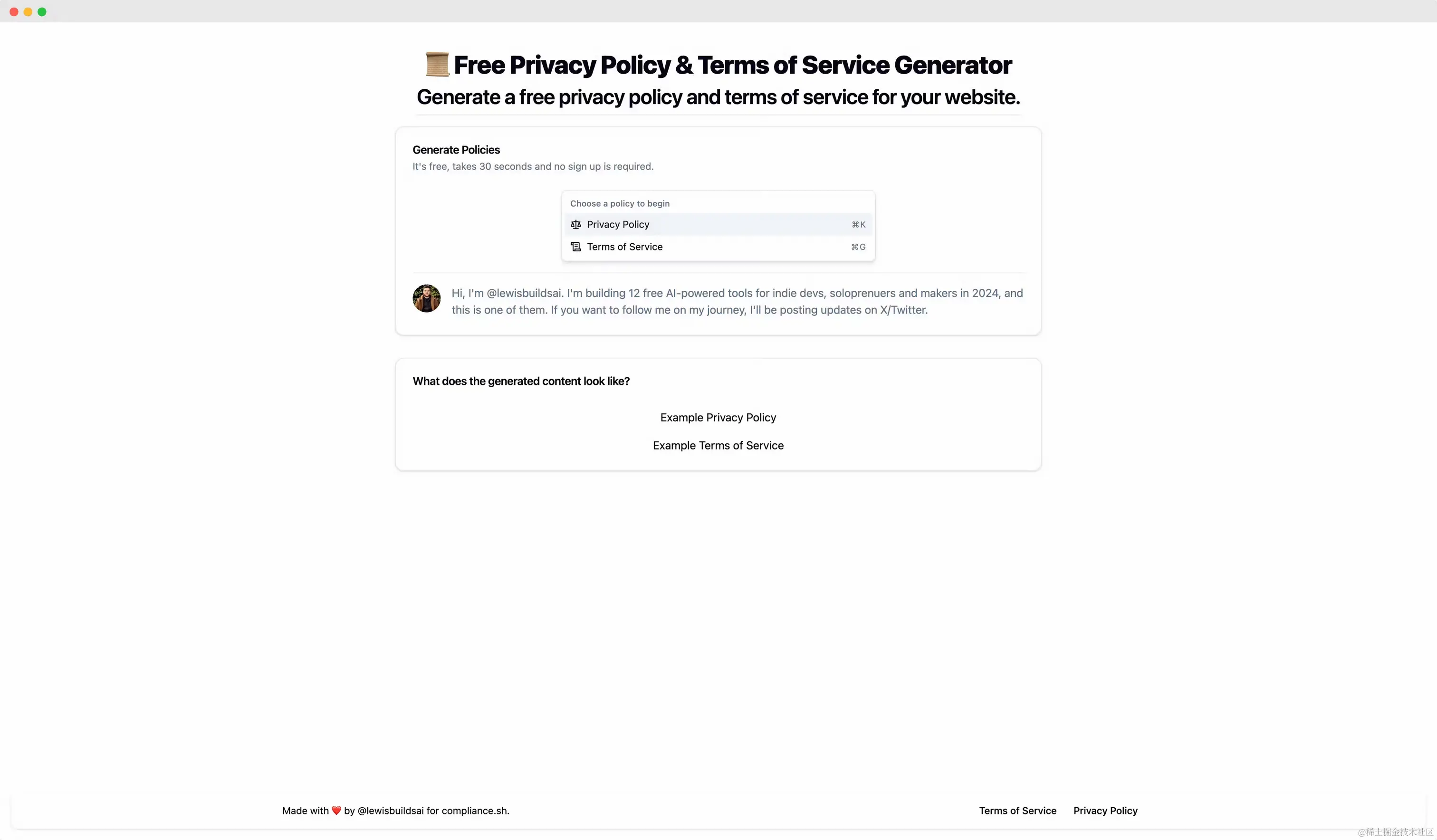 - Free AI Privacy Policy & ToS Generator:隐私政策和服务条款生成工具