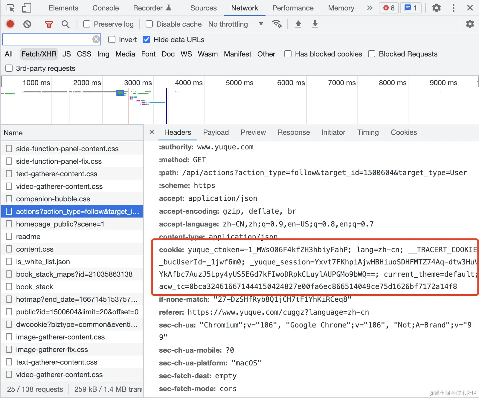 可以看到,在语雀主页中获取 cookie,结果中包含了登录的 cookie、语言、当前主题等。
