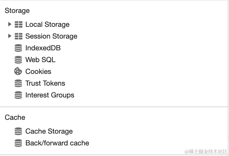 现代浏览器中提供了多种存储机制,打开浏览器的控制台(Mac 可以使用 Command + Option + J 快捷键,Windows 可以使用 Control + Shift + J 快捷键)。选择 Application 选项卡,可以在 Storage中 看到 Local Storage、Session Storage、IndexedDB、Web SQL、Cookies 等: