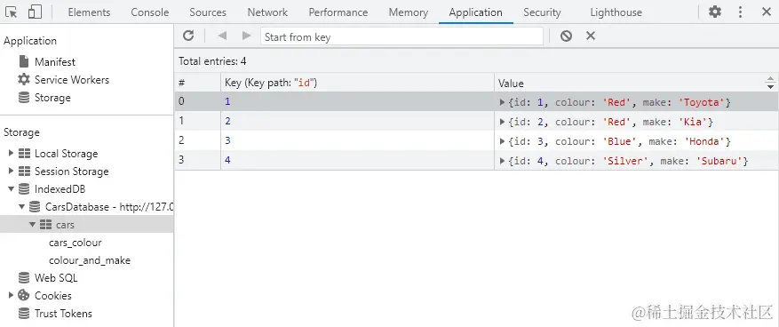 store.put({ id: 4, colour: "Silver", make: "Subaru" });