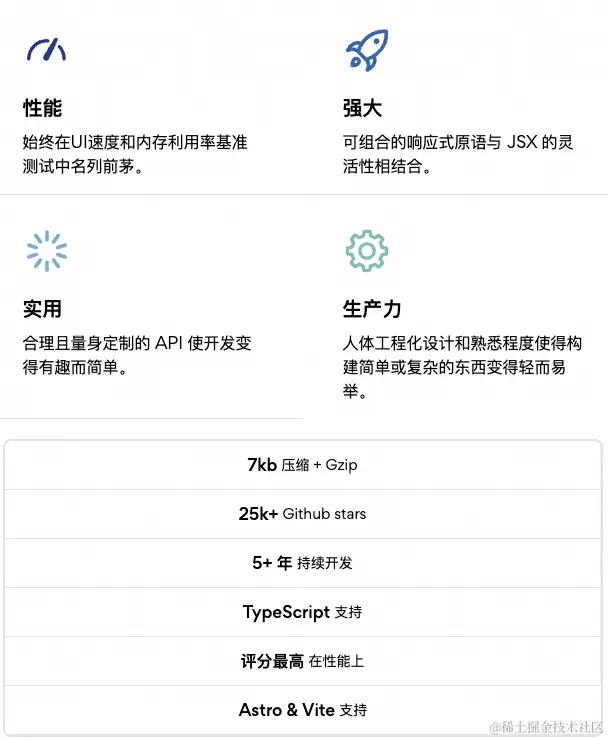 SolidJS 设计时考虑了对 React 用户的友好性,它借鉴了 React 的一些核心概念,使得对于熟悉 React 的开发者来说,学习和使用 SolidJS 相对容易。包括: