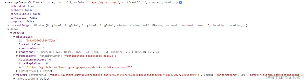 我从打印的数据中截取了部分有用的数据,其中不难发现,data.giscus 是我们想要的数据。如果该篇文章下还没有任何的评论,那么它的值是 error,否则