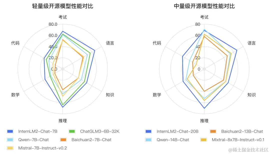 在性能方面,InternLM2在语言理解、知识获取、推理判断、数理运算和代码生成等多个维度上均有显著提升。这得益于其在基础语言建模能力上的实质性增强,使得下游任务的表现也随之提高。尤其值得一提的是,它在一些对推理能力要求较高的评测集上的表现,甚至超过了业界的标杆模型ChatGPT。