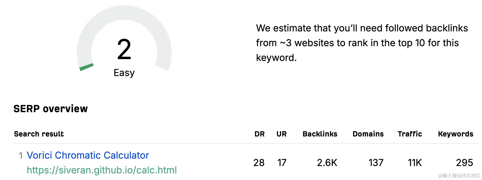 搜了下Vorici Chromatic Calculator关键字,优化难度只有2 (一般难度低于29,都认为难度比较低),只需要3个外链就能排进此自然搜索量前10. 接着所搜了下Vorici的关键字,优化难度也是2,因此决定做Vorici关键字。