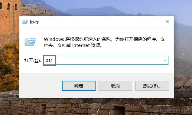 步骤2:在电脑运行窗口中输入 “psr” ,然后点击 “确定” 按钮,这将打开步骤记录器。