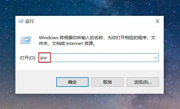 步骤1:使用 “Win+R” 组合键打开运行窗口,输入 “psr” ,点击 “确定” 按钮。