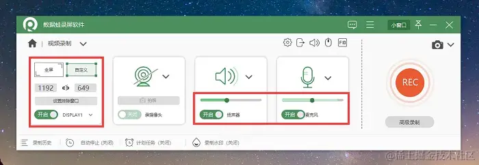 步骤2:在视频录制模式中,我们可以对录制区域与音频来源进行设置,然后点击右边红色按钮 “REC” 进行录屏。