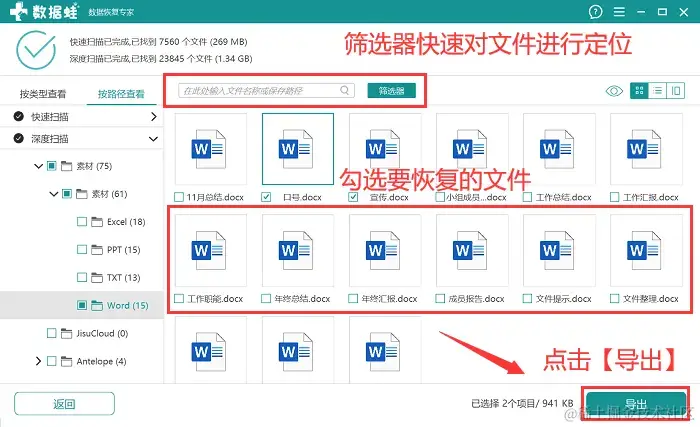 步骤4:深度扫描完成后,如果文件呈现比较多,建议用户在 【筛选器】 中对文件进行快速定位,找到相应的文件后,将它勾选上,完成所有选择后,点击【导出】,导出文件保存在与扫描磁盘有所区别的另一个磁盘中。