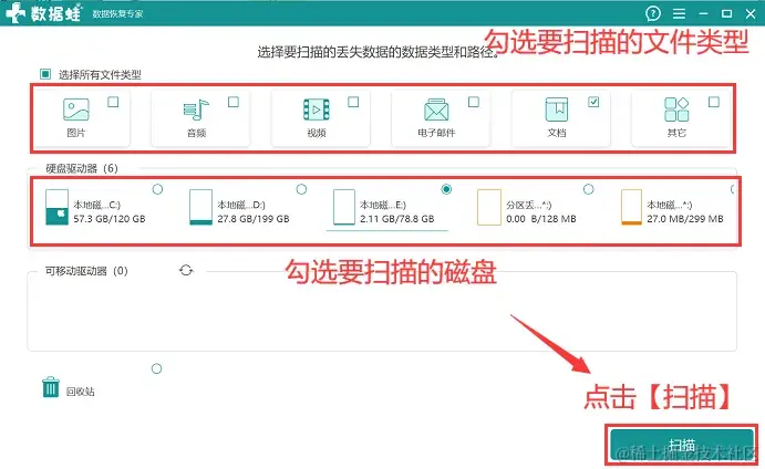 步骤2:根据个人的实际需求,可以对需要扫描的文件类型进行勾选,新用户建议全选,并且将需要进行扫描的磁盘勾选上后点击 【扫描】;