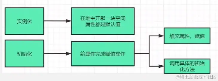 实例化:在堆中开辟一块空间,属性都是默认值。