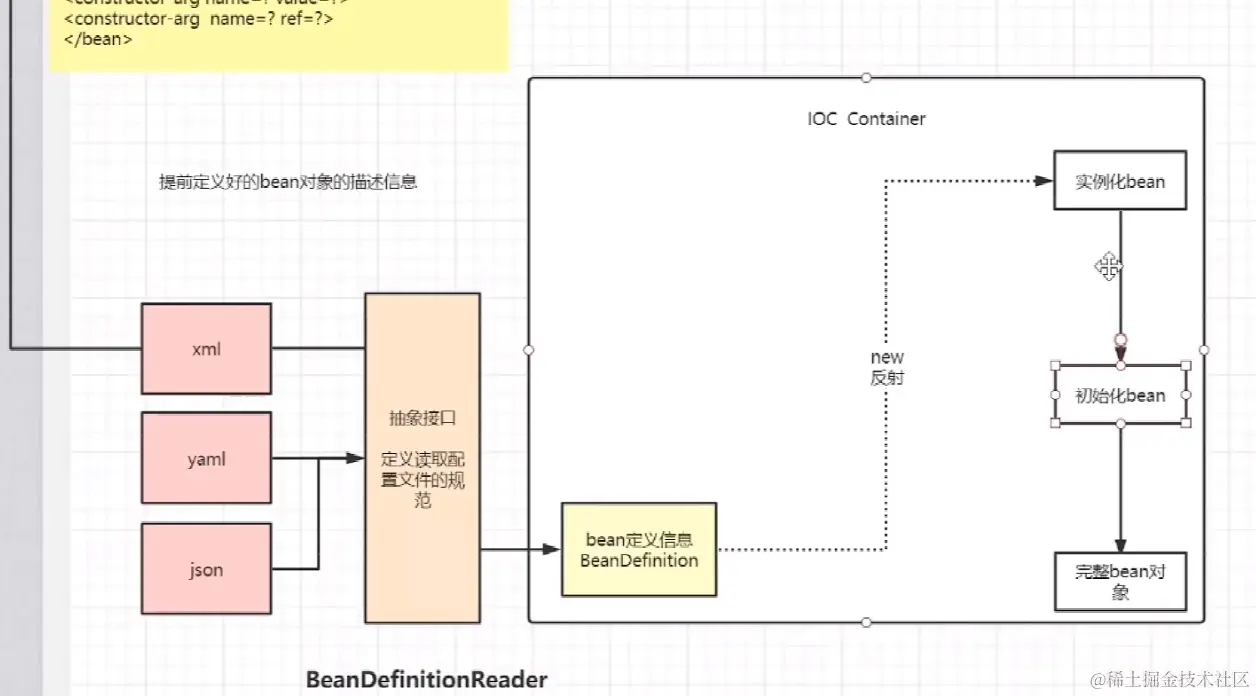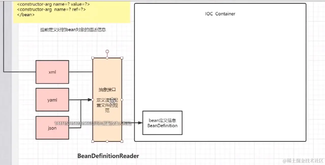 bean定义信息BeanDefinition读取xml配置文件,通过抽象接口BeanDefinitionReader读取配置文件规范,源码当中的ConfigurableListableBeanFactory部分内容就是读取.xml配置文件