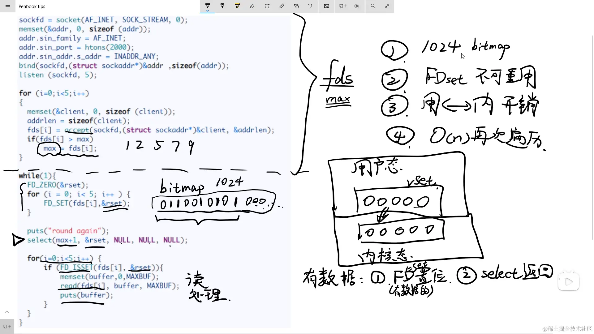 - 调用 select 函数将文件描述符集合拷贝到内核里,使用遍历的方式,让内核来检查是否有网络事件产生