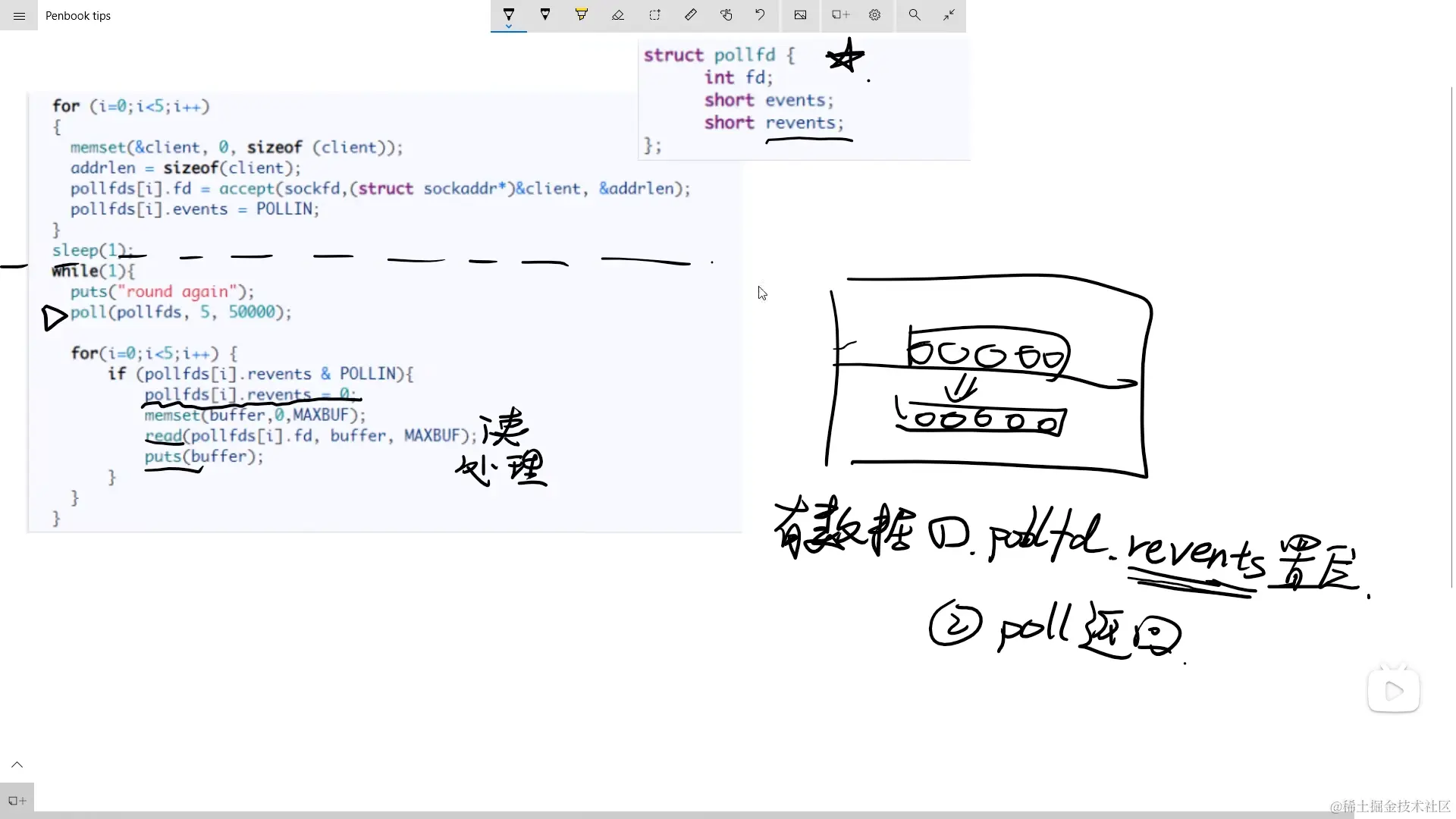 - 最后调用 epoll_wait 等待数据。 等待事件的产生,收集在 epoll 监控的事件中已经发送的事件,类似于 select() 调用。