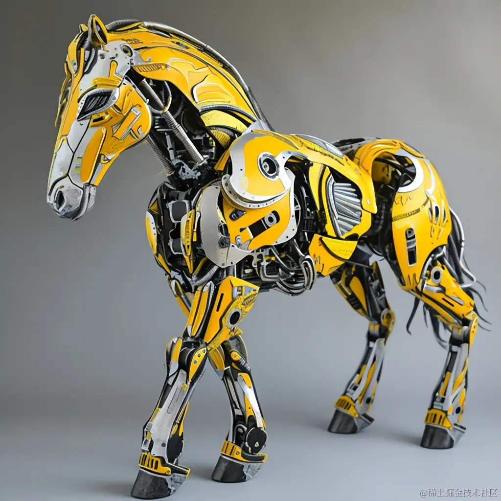 一尊巧妙的机械马雕塑,风格为黄色和银色,带有谜题般的元素,照片级的准确度,生态动力学,柴油朋克,Adafruit,谜题般的拼图