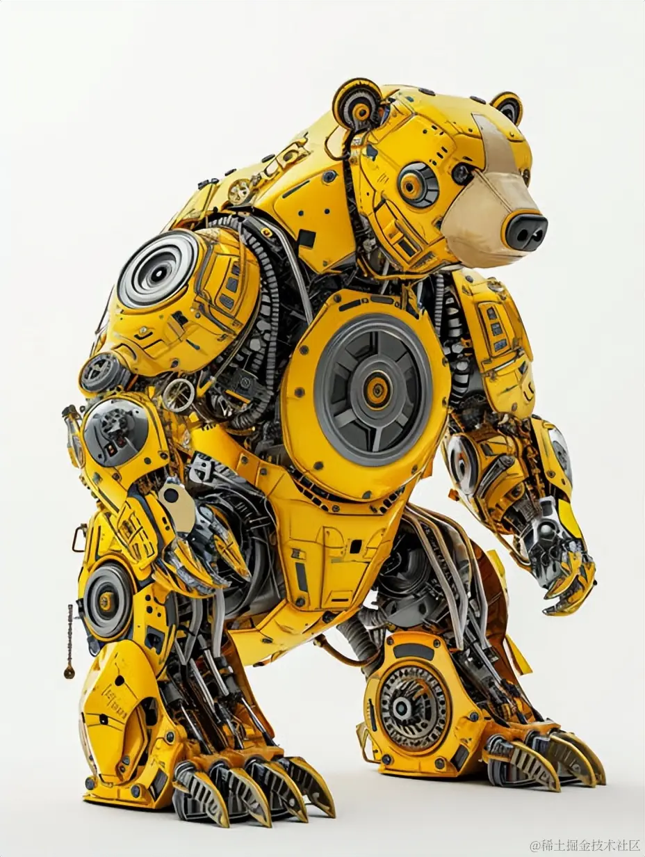 一只由线条、零件和机械制成的机器熊,风格为深黄色,带有谜题般的元素,超逼真,中国朋克,调皮的猫科动物图案,谜题般的拼图,精密主义