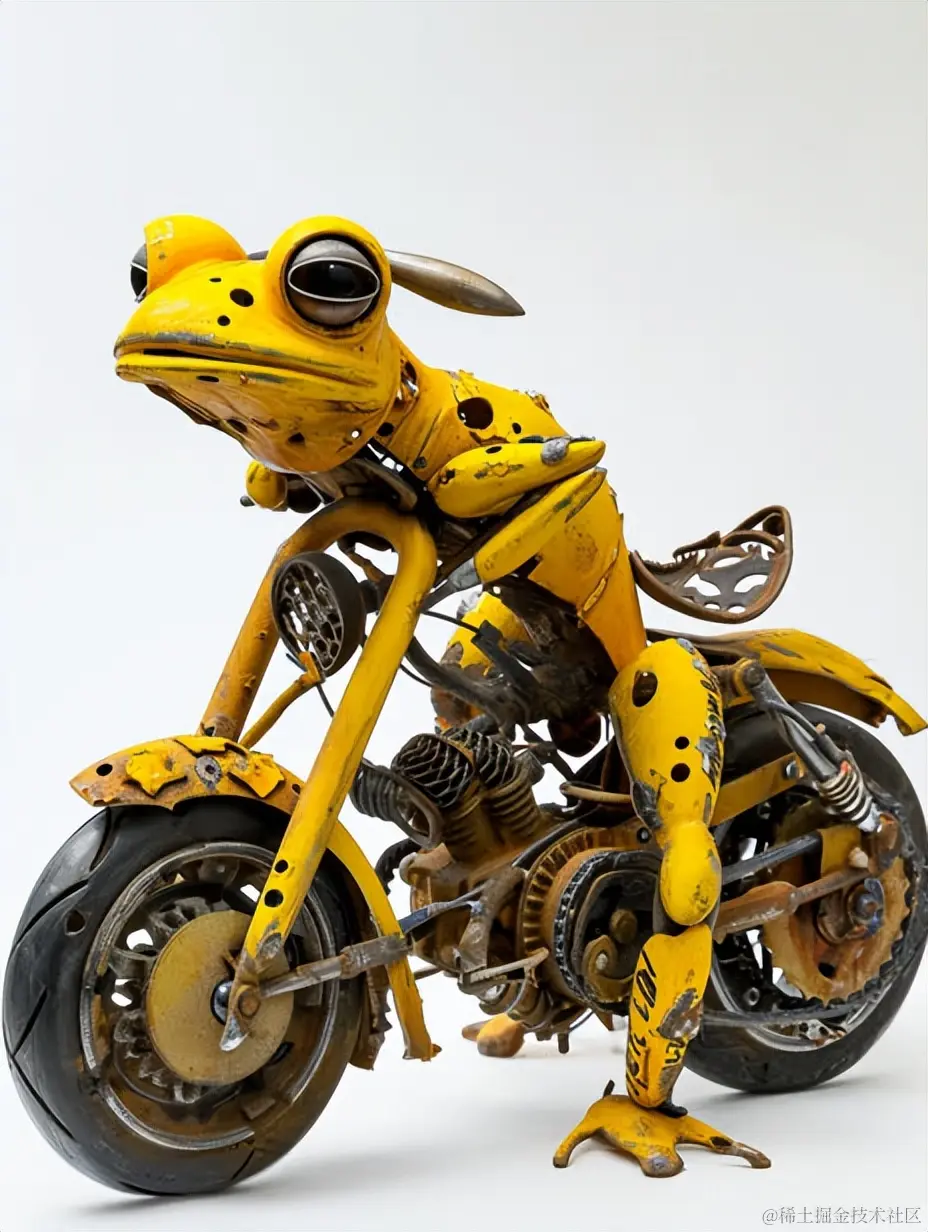 一只老式黄色摩托车青蛙,位于白色背景上,采用谜题般的元素,机器表现主义,延时摄影,金属加工技艺,F/64小组,由昆虫制成,高质量照片
