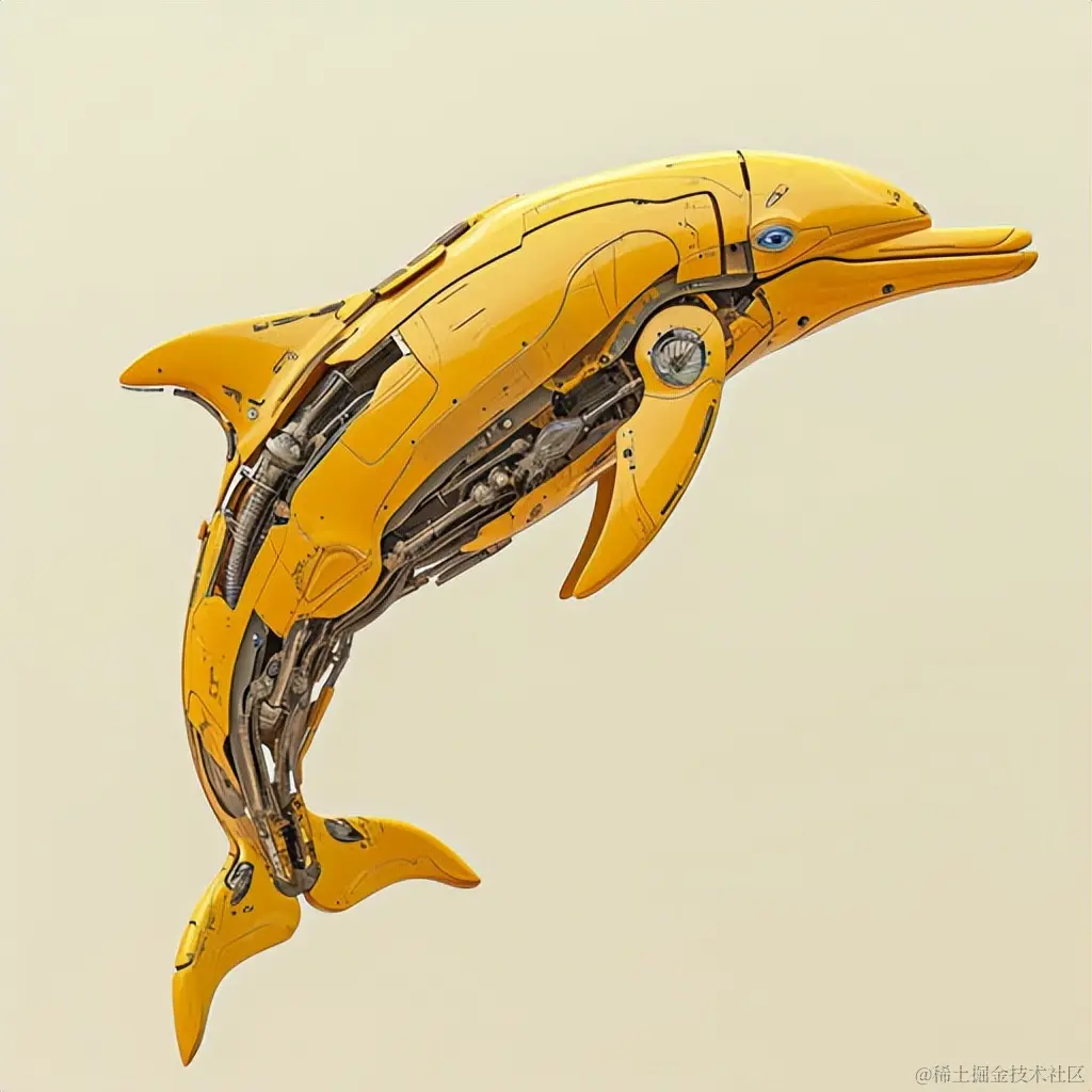 一只机器海豚,背景清晰,腿部可移动,以照片级逼真的野生动物艺术风格呈现,黄色和青铜色,由回收材料制成的壁画,谜题般的元素,ISO 200,Pantonepunk,雄心勃勃