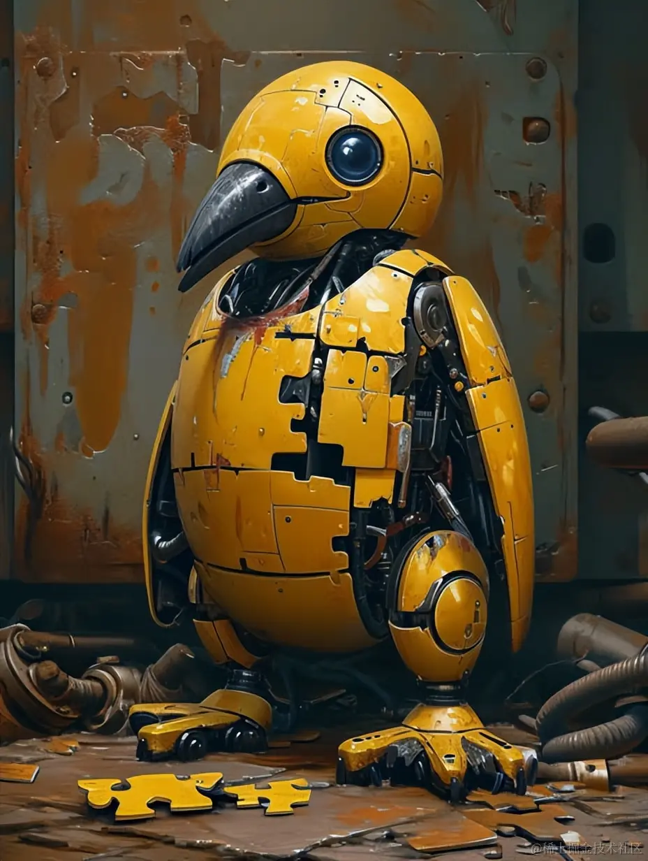 一只黄色机器企鹅正在拼图上制作机器人,以照片级逼真的野生动物艺术风格呈现,全身,Pieter Hugo,时尚的金属光泽,柴油朋克,Alex Petruk(Ape),由以上所有元素制成