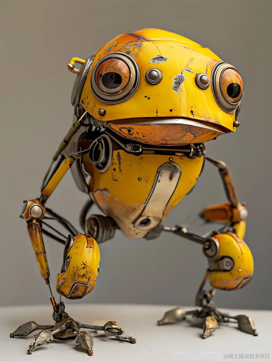 一台看起来像青蛙的老式玩具机器人,以黄色和银色为主题,具有谜题般的元素、逼真的野生动物肖像、钢/铁框架构造、精确主义影响、细致入微的设计,色调为深黄色和浅米色