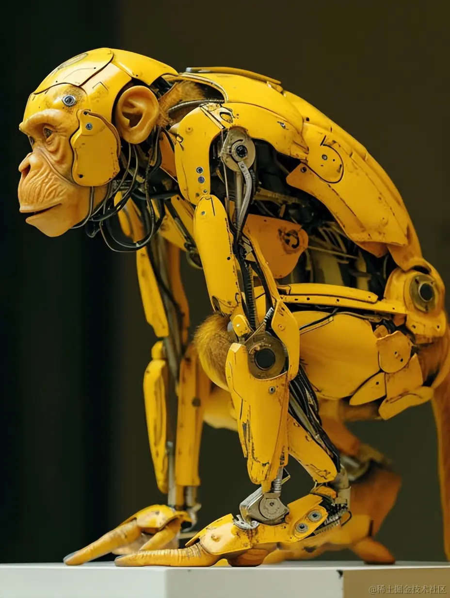 一只特色黄色机器猴,以带有讽刺意味的野生动物艺术风格呈现,带有谜题般的元素,J.C. Leyendecker,极简主义金属雕塑,Jean-Baptiste Monge,全身,模块化构造
