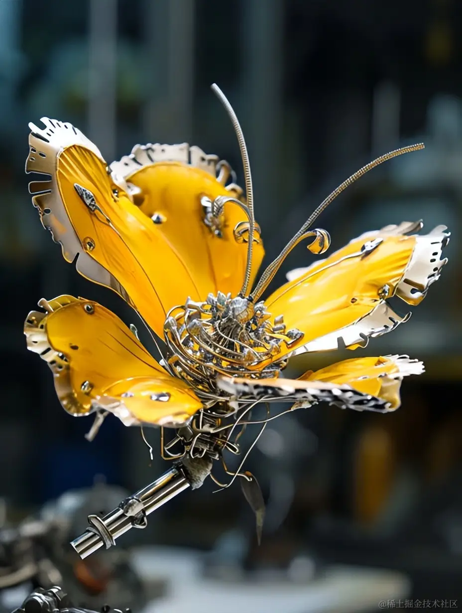 一朵带有银色细节的黄花,被制作成蛾形,以机械化形式、富有趣味的视觉谜题、逼真的生动形象、环保工艺、500–1000年间、柴油朋克、Konica Auto S3风格为特色