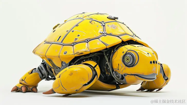 机器龟呈黄色,背景为白色,采用照片级逼真的野生动物艺术风格,谜题般的元素,柴油朋克,Mote Kei,模块化构造,Frogcore,国家地理照片