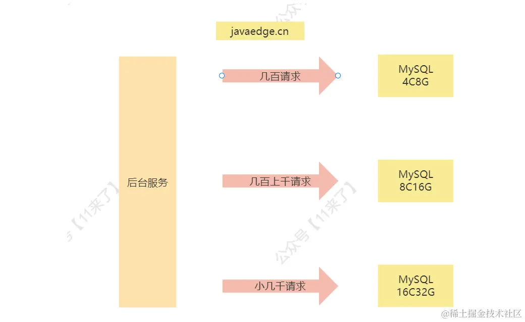 数据库来说,如果原本高峰期每秒三四百请求,扩大 10 倍后,每秒三四千的访问量,如果对数据库横向扩容比较麻烦,因此可以考虑给部署数据库的服务器提升配置,比如从 16C32G 提升到 32C64G 的配置,抗 3-4000 的请求还是没有问题的