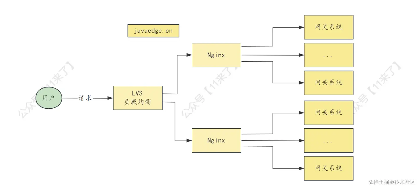 网关系统来说,部署 10 倍的网关机器即可,再通过 nginx 将请求分发到不同的网关中去,就可以分散大量请求压力