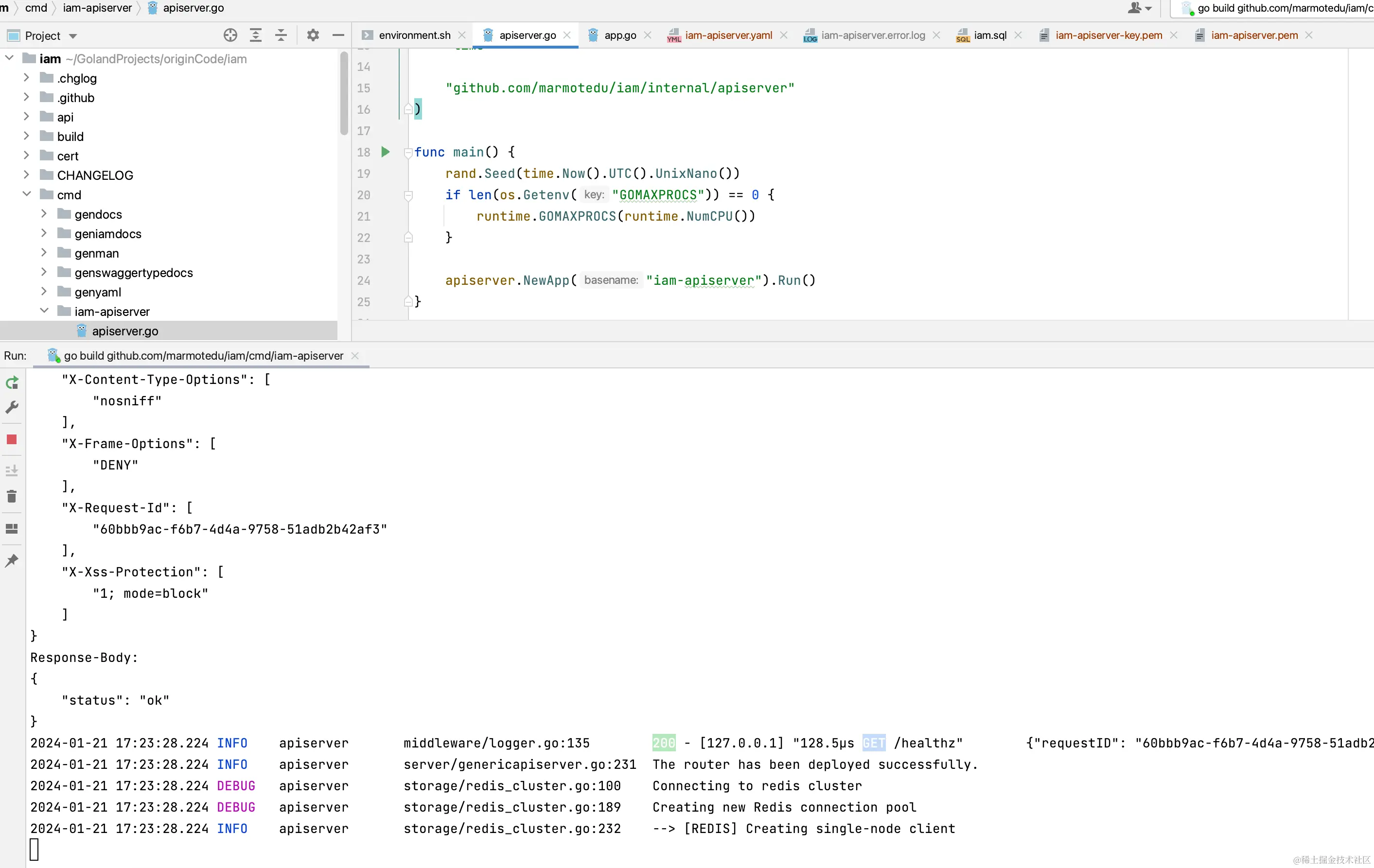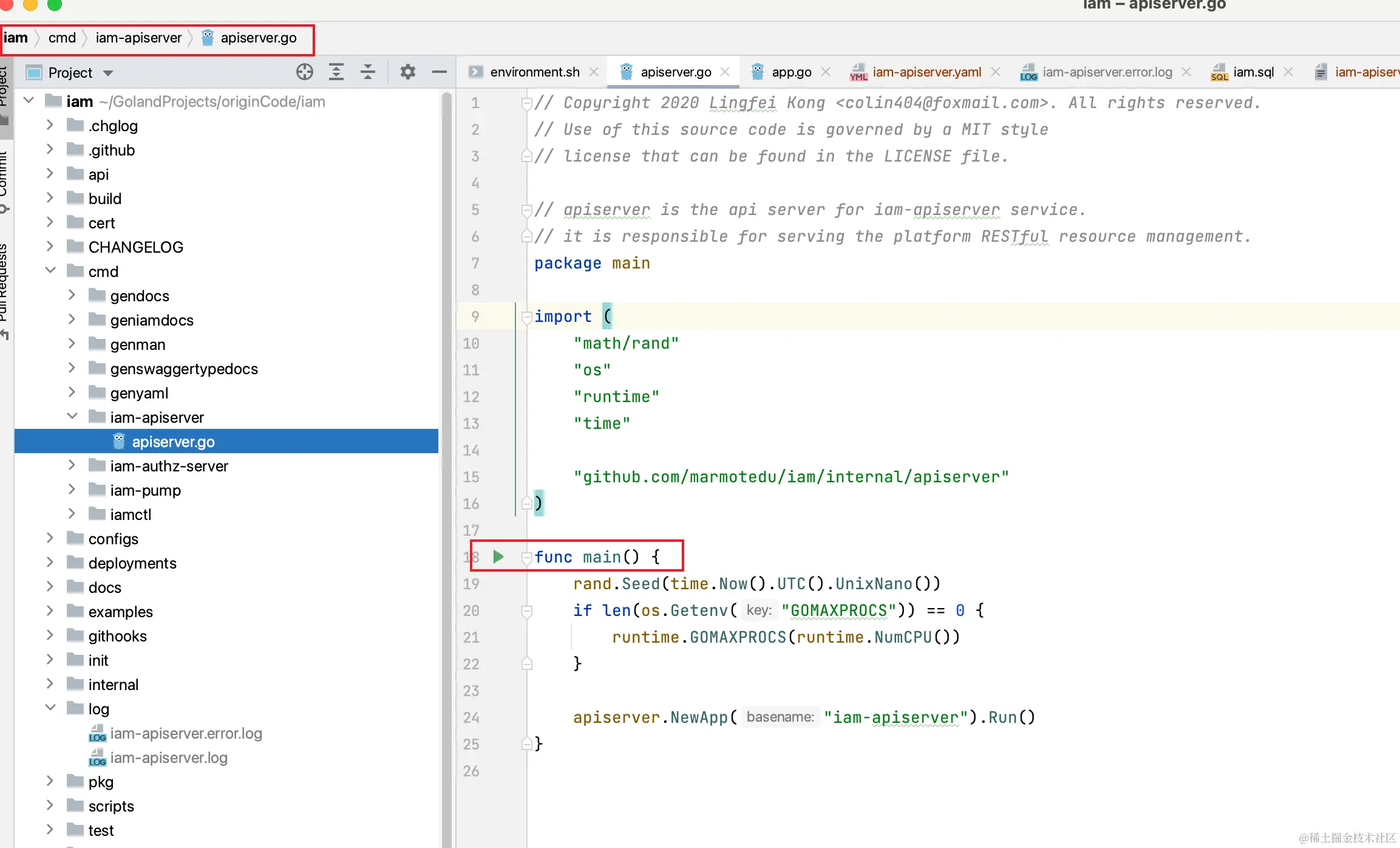 apiserver服务的main方法在:iam/cmd/iam-apiserver/apiserver.go中