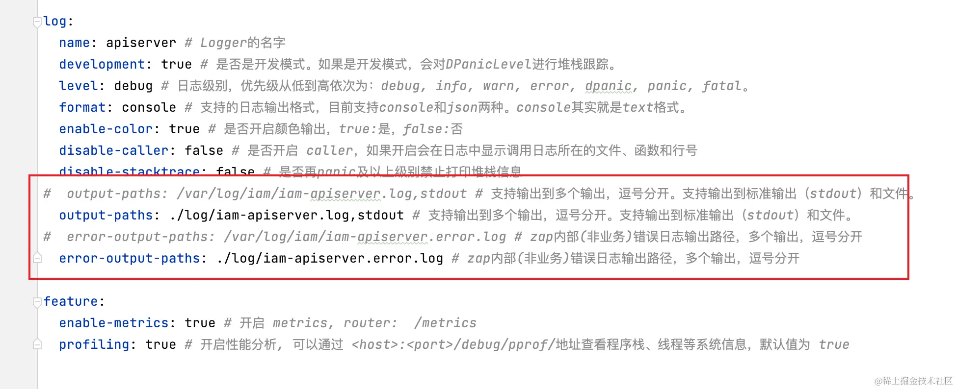 output-paths: ./log/iam-apiserver.log,stdout # 支持输出到多个输出,逗号分开。支持输出到标准输出(stdout)和文件。