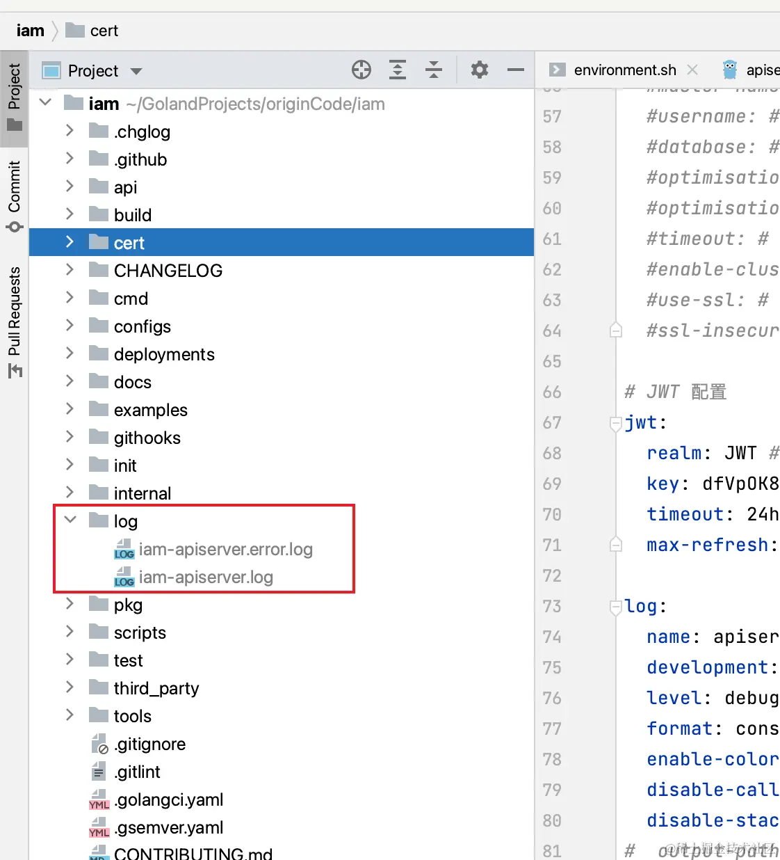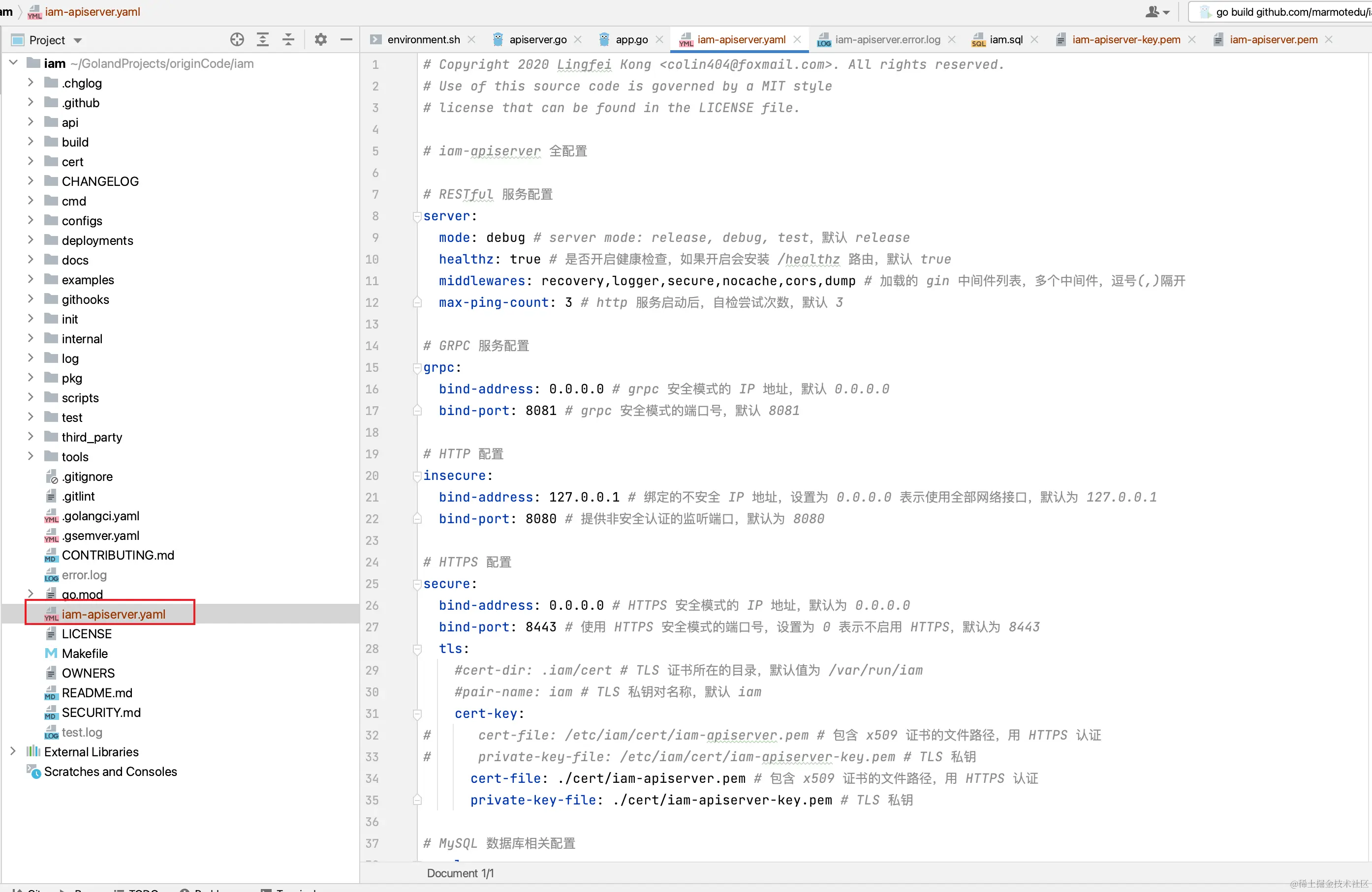 可以按照文章的方式去生成对应的密钥文件,想简单点的话,可以直接用我生成好的两个:iam-apiserver.pem和iam-apiserver-key.pem,我在项目根目录创建了一个文件夹:cert,放这两个文件