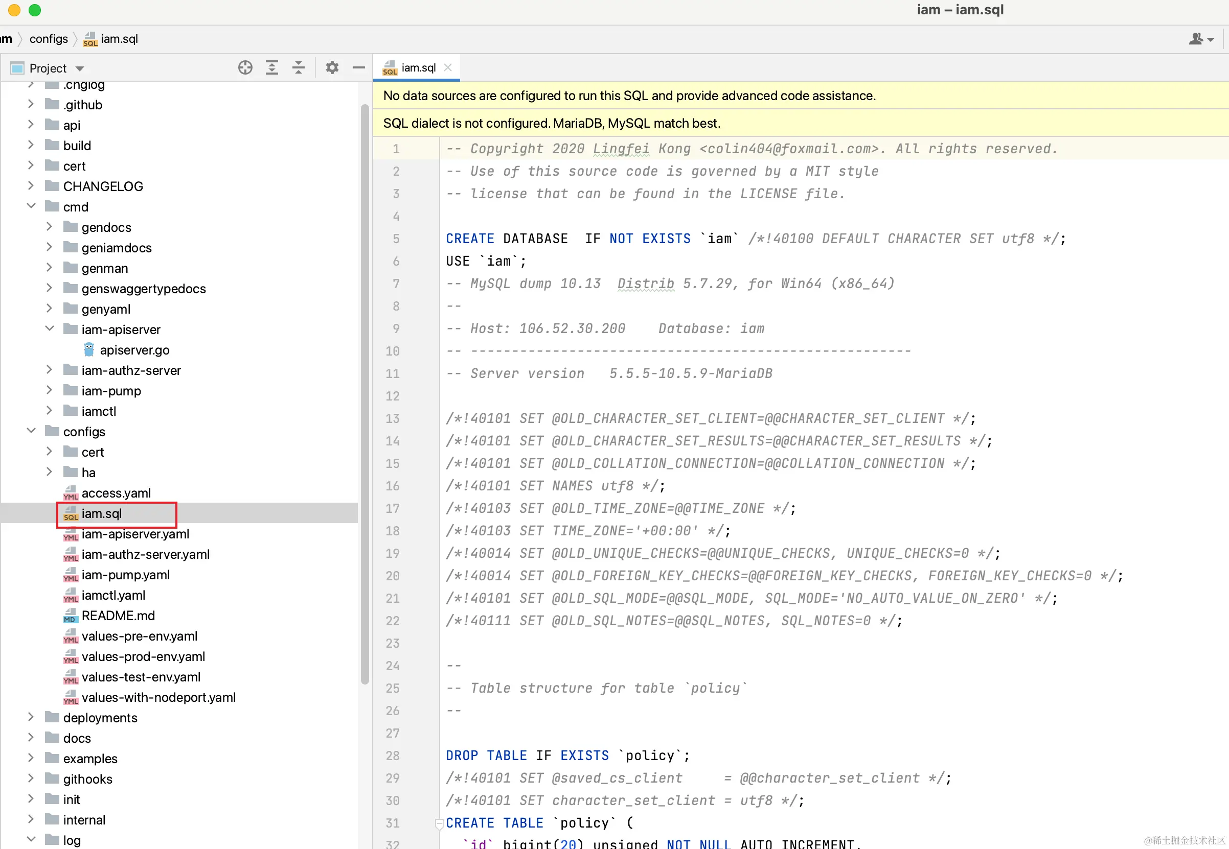 记得把项目的configs/iam.sql在mysql执行下,生成对应的数据库和表