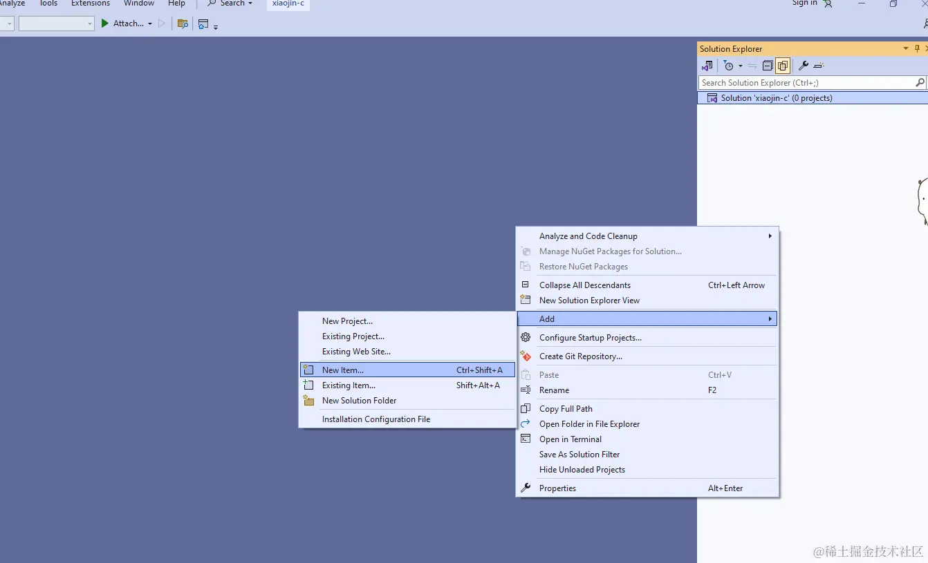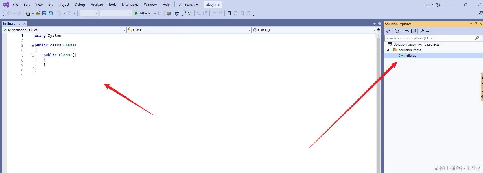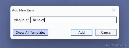 - 在右侧项目空白处,右键新建文件,名字为‘hello.cs’