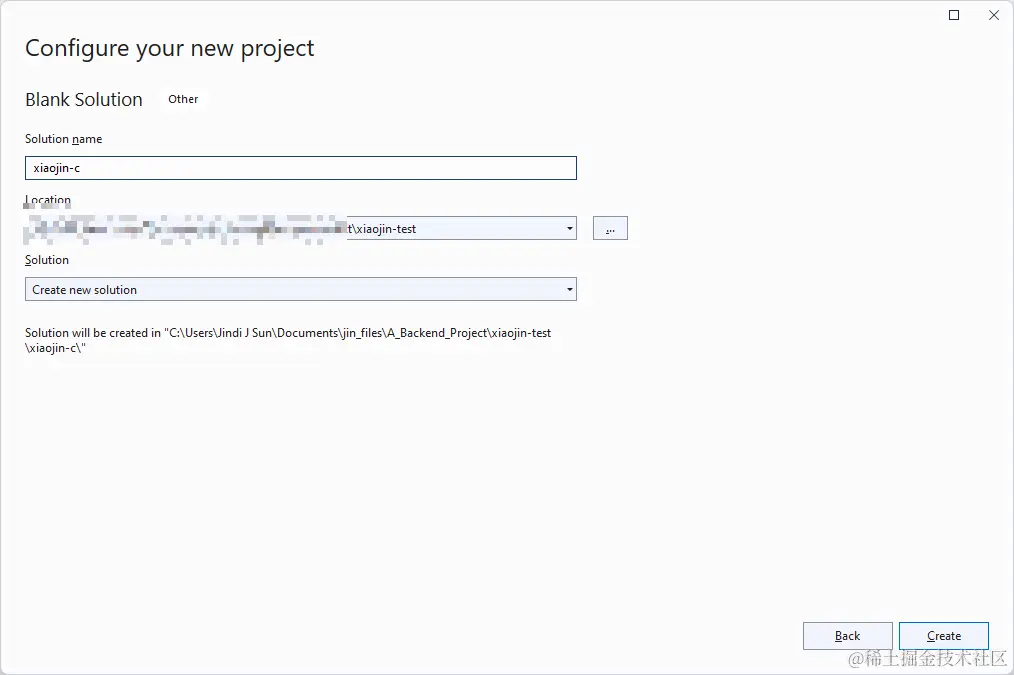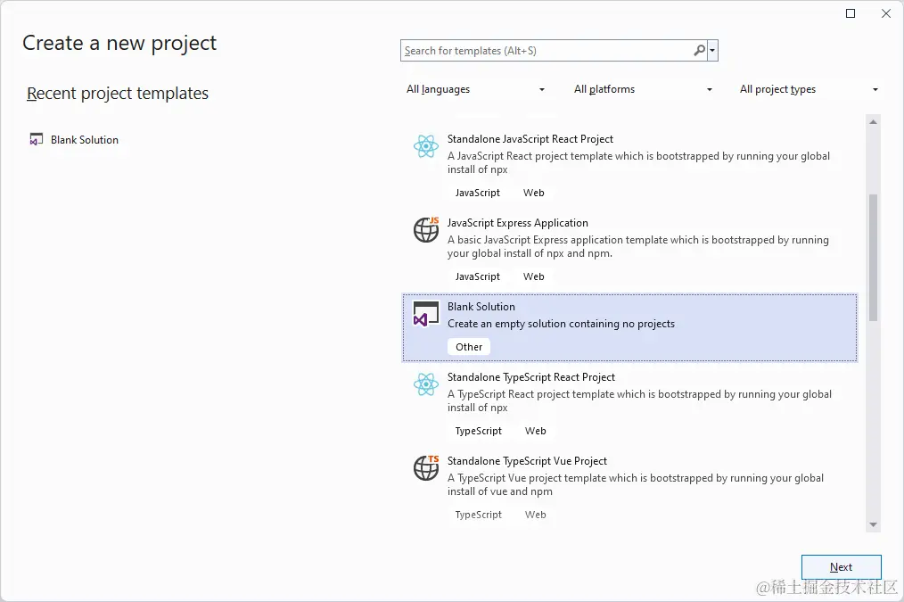 - 从模板中选择“Blank Solution”,然后点击“下一步”;