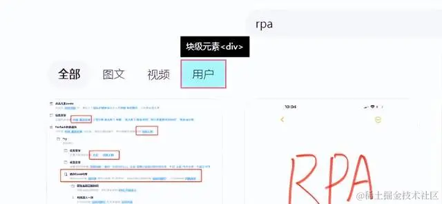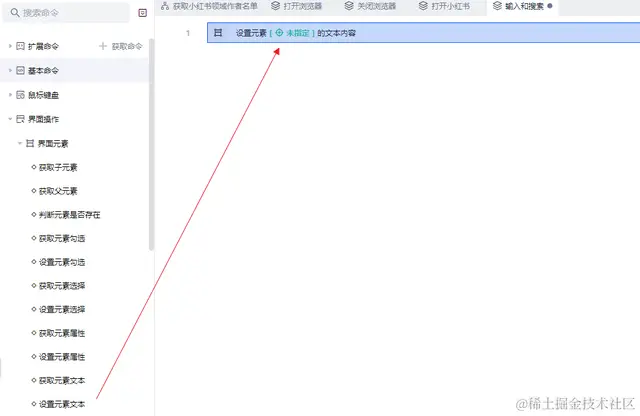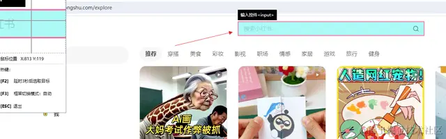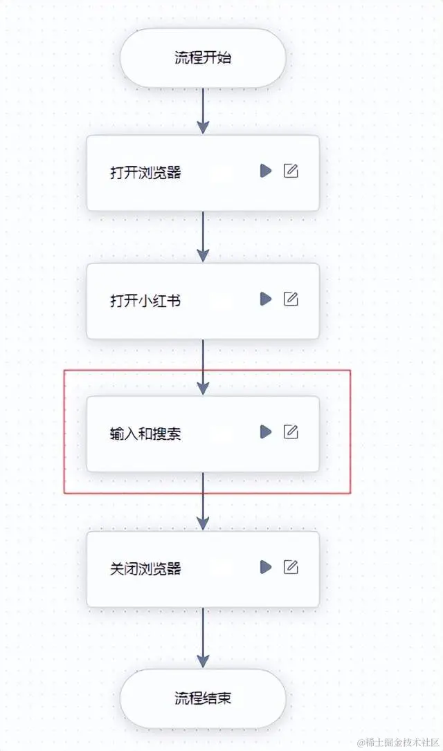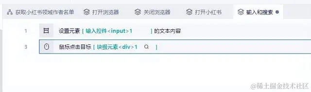 这里就出现了两个元素,一个搜索框、一个是搜索按钮,我们分别把这两个元素定义为a、b,后续的流程为:打开小红书网站、在a中输入关键字、点击b。最后出现的结果又是一个新的元素,我们可以将之定义为c,接上流程就是获取c。