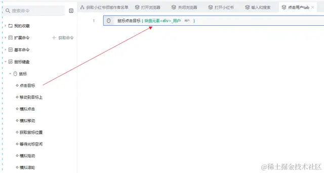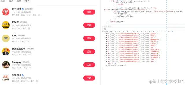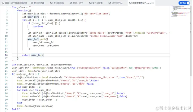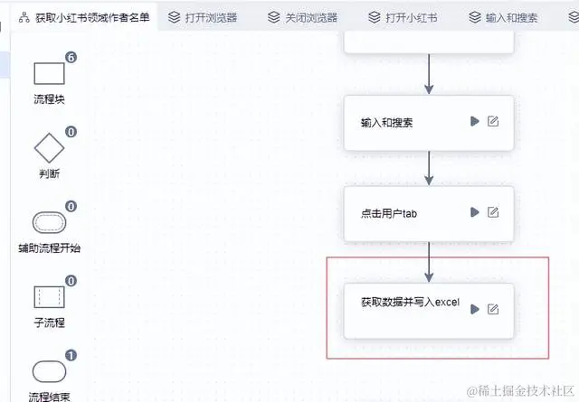 大概的流程如下:打开小红书网址、找到输入框输入关键字、点击搜索按钮、点击搜索结果的用户分类,获取第一页所有用户并导出excel。