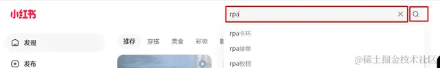 现在有一种这样的场景:我们需要知道小红书某个领域有哪些作者,我们就需要先打开小红书的官网,找到搜索框再输入关键字,比如:rpa。