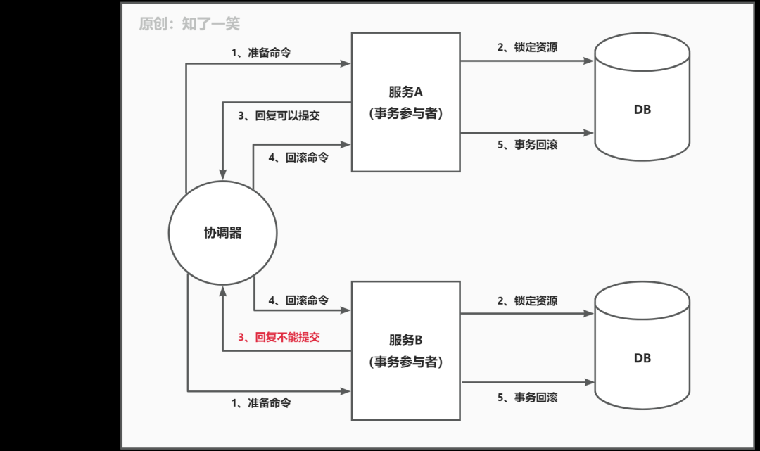 **2、第二阶段:**事务协调器收到每个事务参与者的回复后,统计每个参与者的回复,如果每个参与者都回复“可以提交”,那么事务协调器会发送提交命令,参与者正式提交本地事务,释放所有资源,结束全局事务。但是有一个参与者回复“拒绝提交”,那么事务协调器发送回滚命令,所有参与者都回滚本地事务,待全部回滚完成,释放资源,取消全局事务。事务提交流程