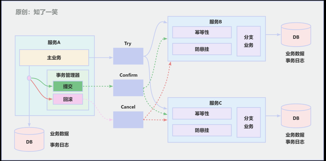 TCC是三个单词的缩写:Try、Confirm、Cancel,也分为这三个流程。