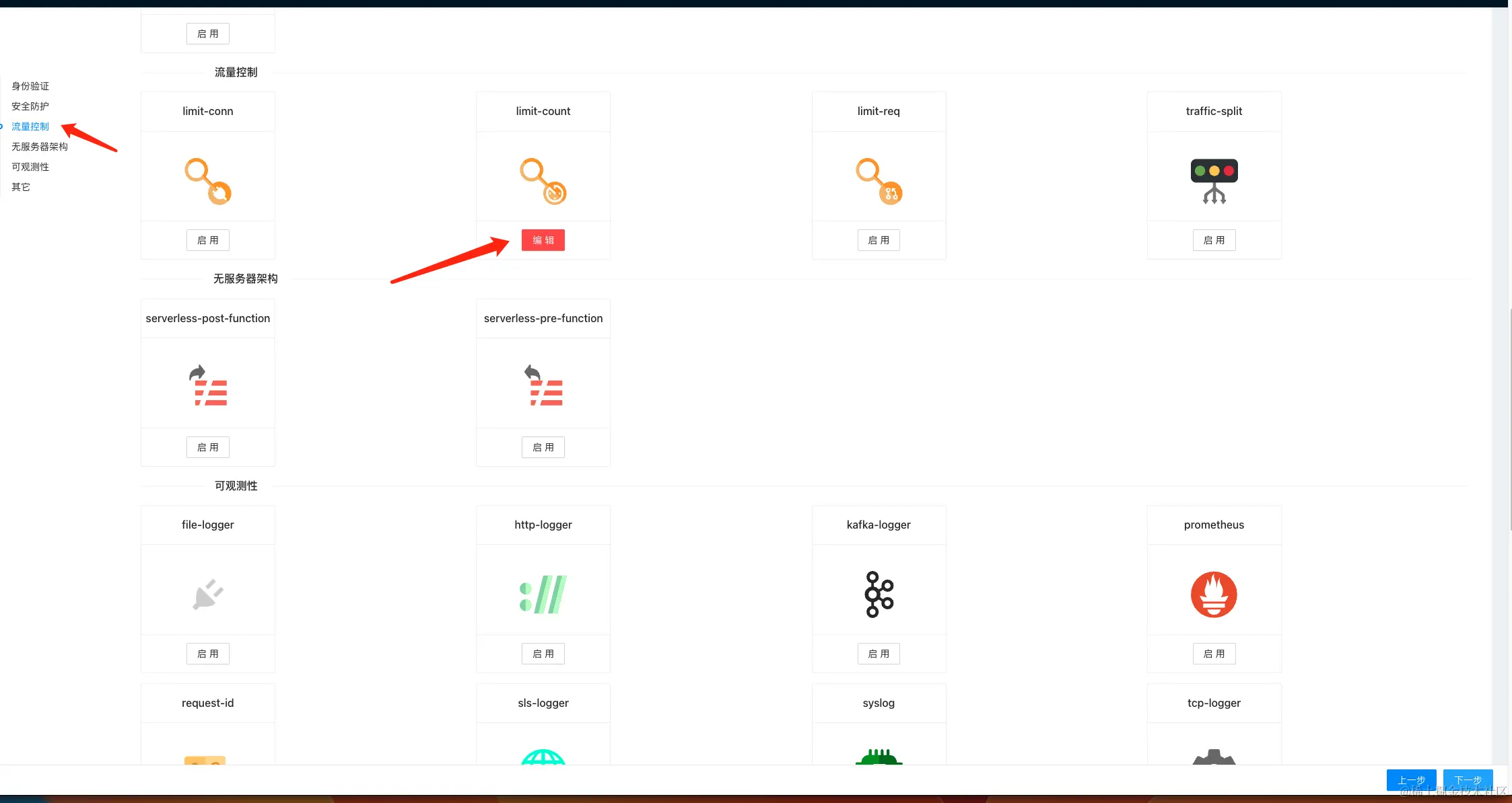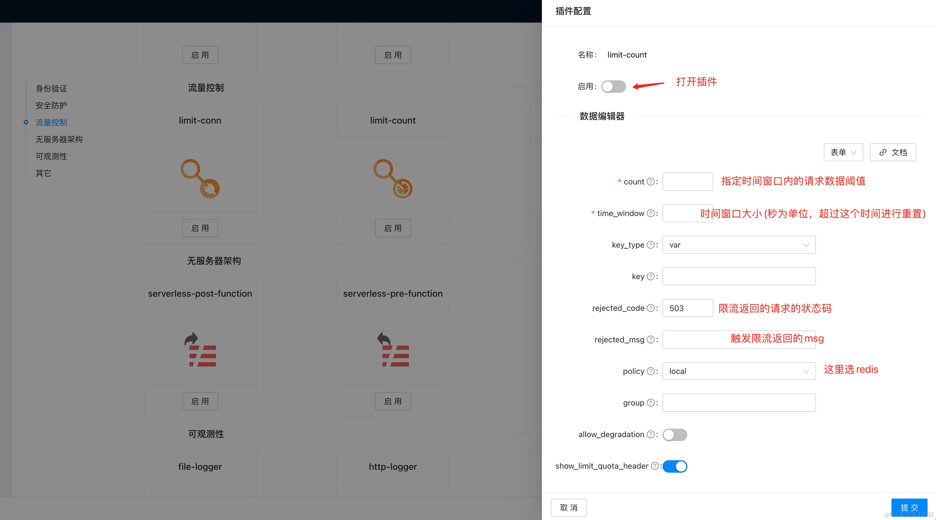 限流相关的功能主要在插件里面。所以我们需要选用限流的插件